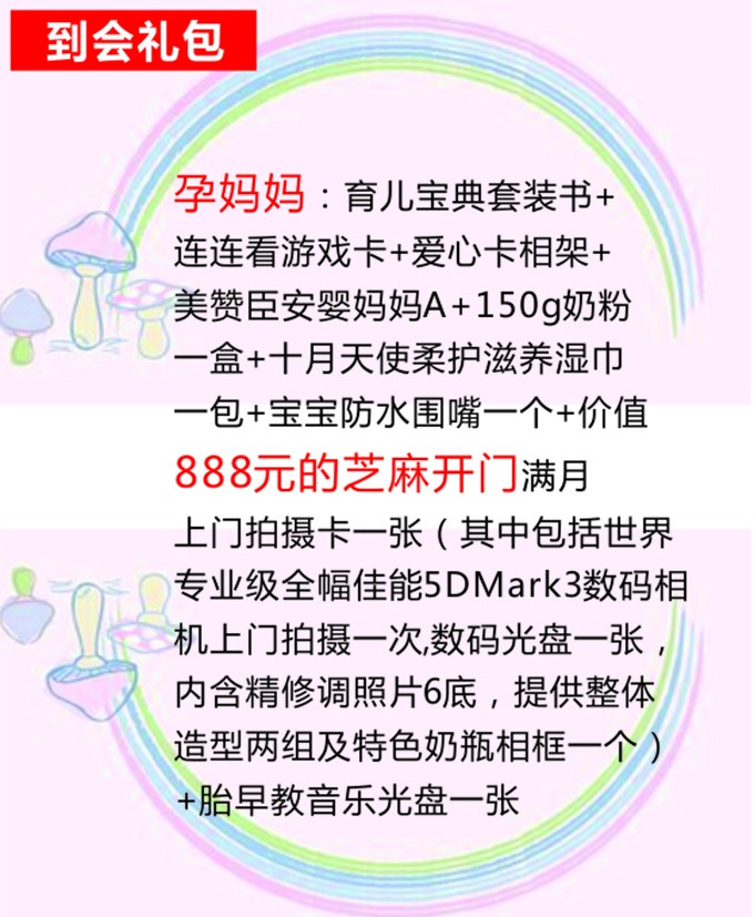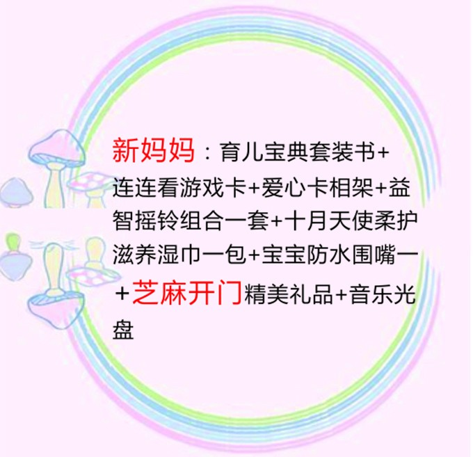 孕妈妈:育儿宝典套装书+连连看游戏卡+爱心卡相架+美赞臣安婴妈妈A+150g奶粉一盒+十月天使柔护滋养湿巾一包+宝宝防水围嘴一个+价值888元的芝麻开门满月上门拍摄卡一张(其中包括世界专业级全幅佳能5DMark3数码相机上门拍摄一次,数码光盘一张,内含精修调照片6底,提供整体造型两组及特色奶瓶相框一个+胎早教音乐光盘一张