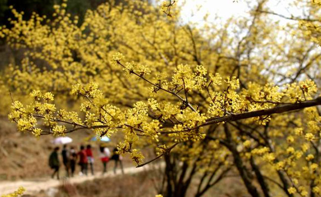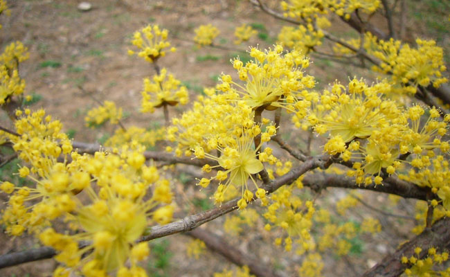 人们种植山茱萸更多的是为了它的果,又有几人见识过它的花呢?当迎春蓓蕾初绽的时候,山茱萸已悄然开花,在仍显苍茫寂寥的山野,金黄的伞状小花,像孔雀冠上的金翎,又似如云秀发上的步摇。像第一缕春光突然灿烂在乍开的眼前,却比春光更浓烈,恣意的开在田间地头。