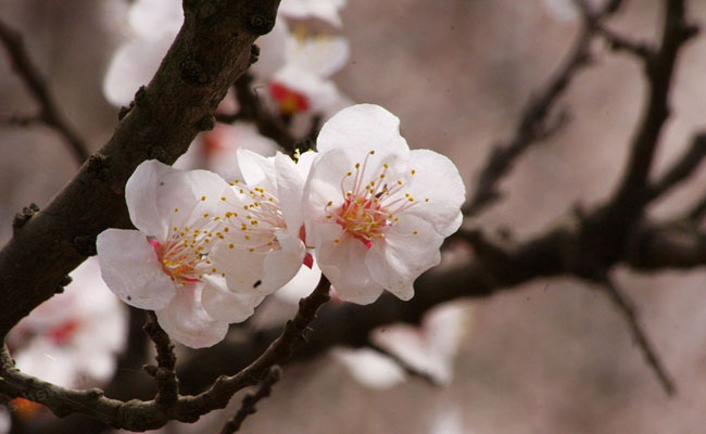 杏花,花单生,先叶开放,花瓣白色或稍带红晕。花形与桃花和梅花相仿,含苞时纯红色,开花后颜色逐渐变淡,花落时变成纯白色。
