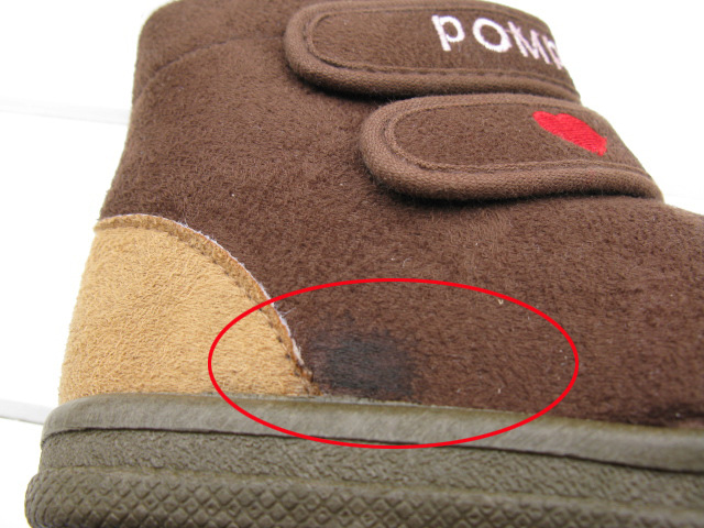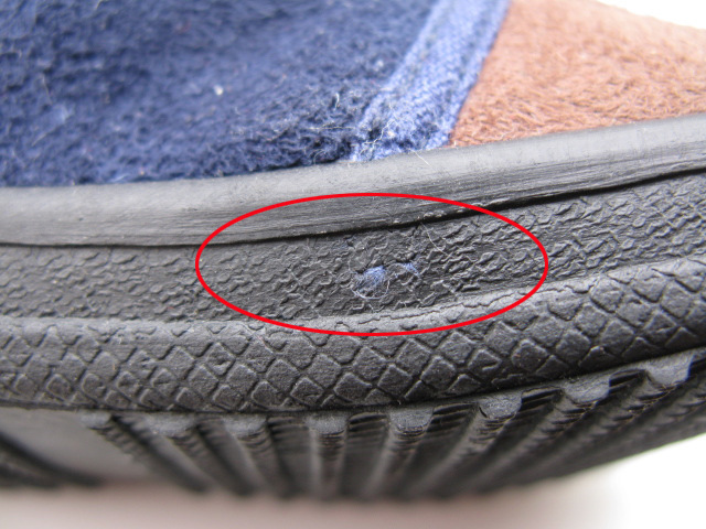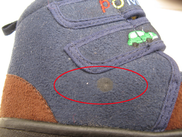 本款微有一点瑕疵,鞋面上有几处胶斑以及淡黄色的脏斑,并有一些轻微的磨损,鞋边缺边料。详见图片,亏本出售,介意的妈妈慎拍哦!